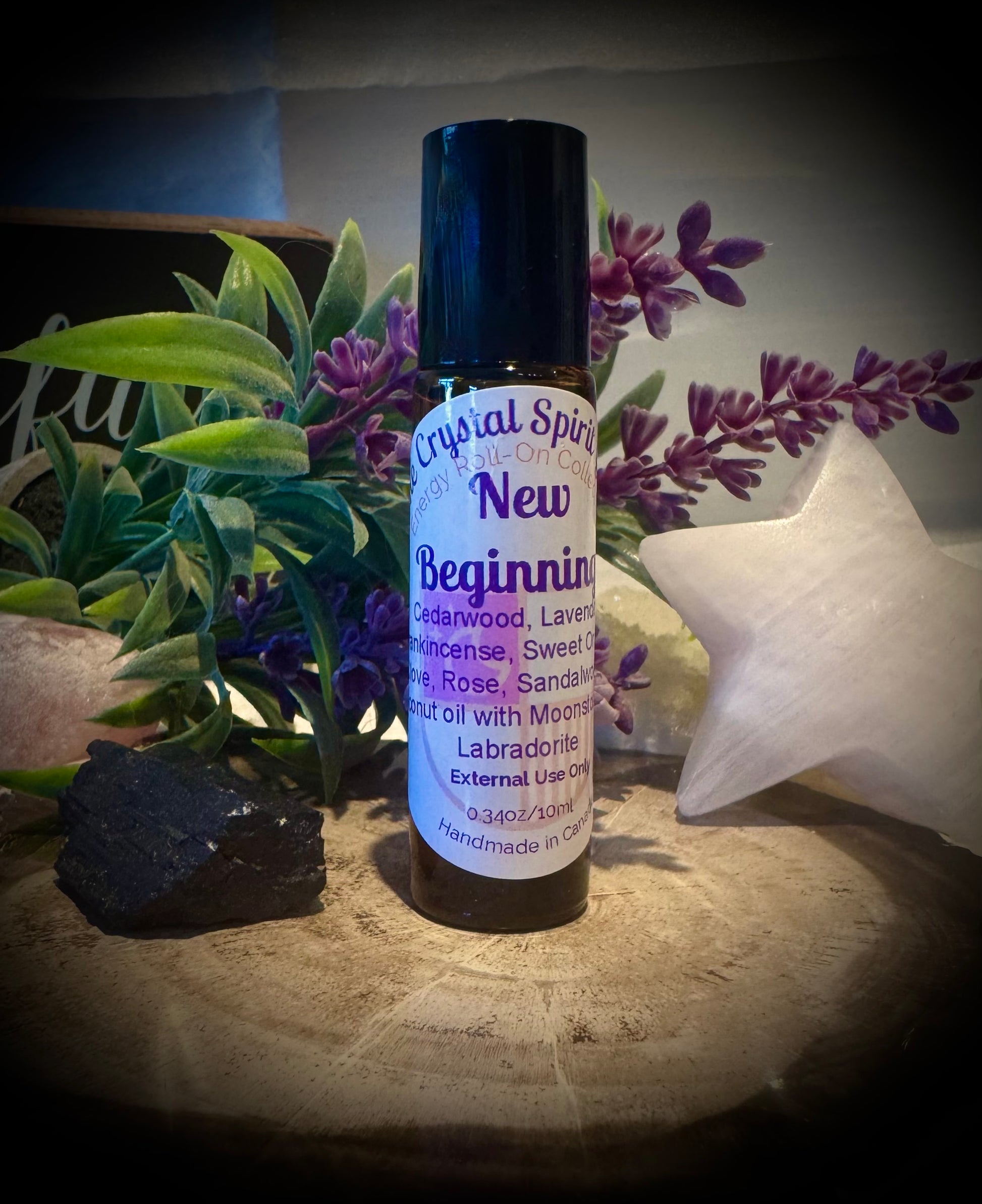 Cedarwood, Lavender, Frankincense, Sweet Orange, Clove, Rose and Sandalwood in Coconut Oil with Moonstone and Labradorite Crystals.